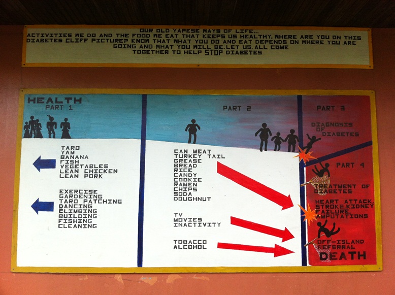 This sign pretty much sums up some of the food issues on Yap. As on other Pacific islands, the ease of fast, prepared foods is luring many people, children and adults alike, to choose Vienna sausages, SPAM, and Pringles over a traditional native diet of taro root and fish. Lots of sweetened cereals, sweetened breads, canned fruits in heavy syrup, sodas. Some fruits (mangoes, papayas, pineapple, etc.) are grown on the island, plus taro, breadfruit, beans, sweet potatoes, and a bunch of leafy greens. And lots of fish (caught nearby, not grown). But the vast majority of food is brought by container ships, or on one of the 3 flights that lands here weekly.