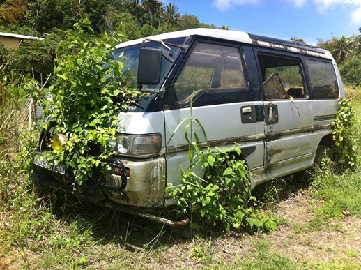 Rain plus heat equals decay.  Apart from the obvious constant decomposition and regrowth cycles of all plant materials, we’re also surrounded by houses, roads, and cars decaying around us. Really old and dead cars, or maybe not so old but still dead cars, are often roadside with vines snaking up and out of every automotive orifice.  In enough time it won’t be recognizable as a former-vehicle anymore, except maybe for the occasional glimpse of a rusted wheel joint.