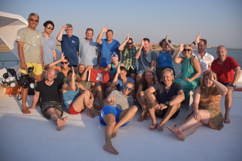 Making the shark sign. Our group: 9 Germans, 2 Austrians, 2 Americans, 2 Canadians, 2 British, 1 Dutch, 1 Korean, 1 Swede, 1 Swiss (dive guide), 1 Egyptian (dive guide).