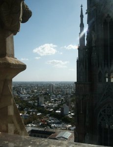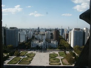 La Plata was founded in the 1880s by a man named Dardo Rocha. He and his wife are encrypted in the basement of the neo-gothic cathedral that’s in the center of the city. Relatively young cathedral (towers were completed just in last decade) with nice French stained glass windows. It’s the tallest cathedral in all the Americas, higher than St Patricks in NYC and that new one somewhere in Mexico too. Or at least that’s what I think I understood from the man in the elevator, whose rapid Spanish was a challenge to non-native ears, but wikipedia concurs. From the top of the tower one can look out over City Hall and the gubernatorial buildings (the white one and the two adjacent towers); La Plata is the capital of the Provincia de Buenos Aires. It’s also known as an academic city and has a number of universities, including the national one with which Chris’s group is affiliated.
