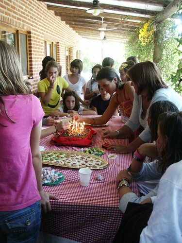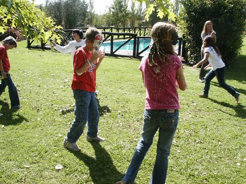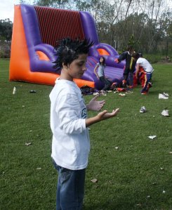 Today is a national holiday – Dia de las Malvinas (Falkland Islands). So no school for the kids, no work for Chris, and little quiet at home. We spent the afternoon with friends (Barbara and Daniel; Barbara works with Chris at CETMIC); two of their daughters were celebrating birthdays. It’s the Argentine custom to invite your entire class to your party – no hurt feelings here – so this is what a gathering of 25+ 12-yr-olds looks like. The velcro jump suits (that’s Julia on the left) were second in popularity only to the spray cans of soapy foam, labeled “artificial snow.” The 7th grade girls enjoyed combining the foam with the trampoline, while the 7th grade boys preferred to slick down their hair.