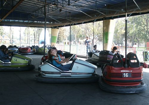Today was spent at Republica de los Niños, a 1950s-era park very near our house. Walt Disney visited the place when it had recently opened and said it inspired him to build Disney Land. These days it’s a bit shabby around the edges, but we did get to feed llamas, ride trains, slurp ice cream, and bake in the sun. Elvi is not a big fan of spinning around upside down, or spinning around at all for that matter, so she opted out of all rides that involved leaving the surface of the Earth. Even so, the heat and just the sight of Eric and Julia (and Emily too, for that matter) on the rides made her nauseous. She wasn’t a happy camper by the end of the day. I was again grateful that the worst thing to happen was sunburn, given the lack of safety measures on all rides outside of the safety-paranoid US. Plus, spinning around upside down on ancient amusement park rides can’t be any more dangerous than driving the freeways of Southern California, statistically speaking.