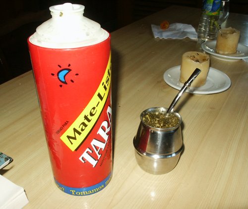 Drinking mate (with two syllables in Spanish, “mah-tay”) is a tradition throughout southern South America. It’s an herb – looks a lot like oregano – that you stuff into a container (traditinally a gourd, but now more likely wood or metal) – which is also called a “mate.” Before you fill the container you put in the metal straw (bombilla) that has a strainer/filter on the end. You pour hot water over the mate and then drink the “tea” through the straw. It does have caffeine, maybe as much as a soda ? – so it’s both a mild stimulant and effective at calming an upset stomach.